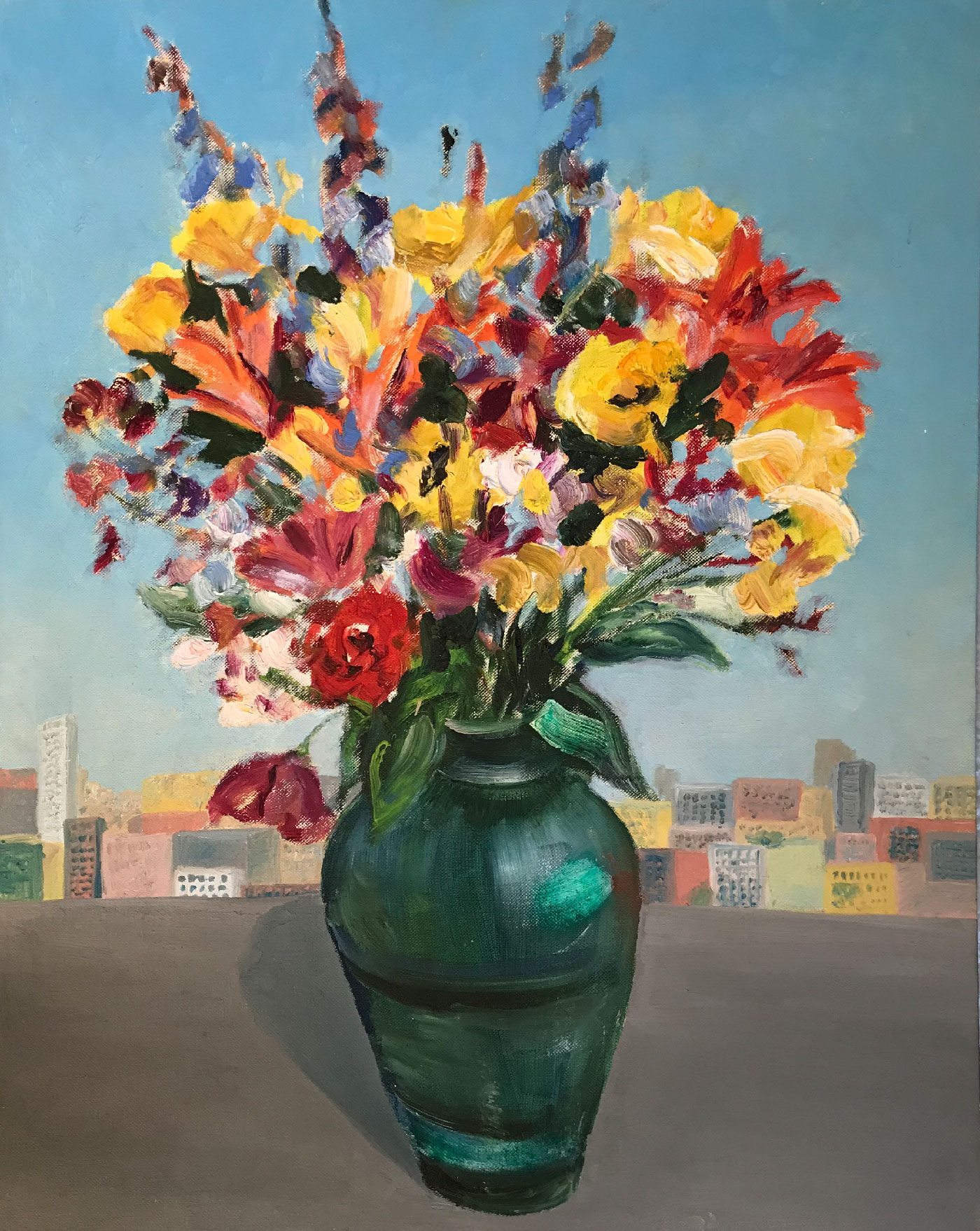 Blumenstrauss vor Grossstadt, 60x93cm, 1989